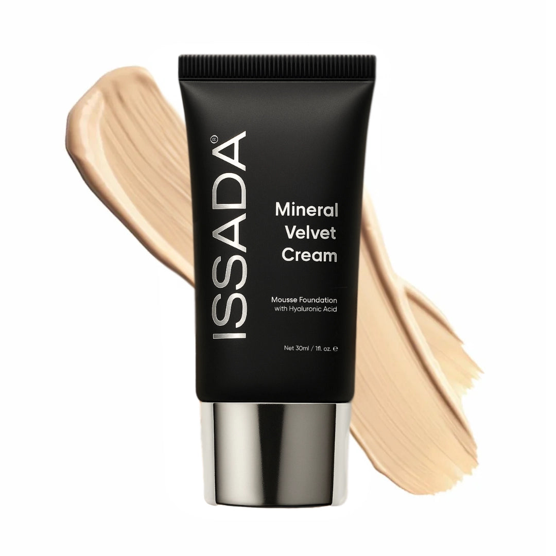 Our Mineral Velvet Cream is Australia’s first (and best) liquid mineral foundation. A bestseller in the ISSADA foundation range, this breathable, medium-full coverage liquid foundation perfectly conceals pores, hides blemishes, and evens out skin tone. Our buildable, mouse-like whipped cream visibly corrects and smooths skin while leaving a flawless finish. Enriched with hyaluronic acid and vitamins A, C, and E, this foundation is vegan-friendly, and suitable for all skin types (including but especially Normal through to oily and acne prone.