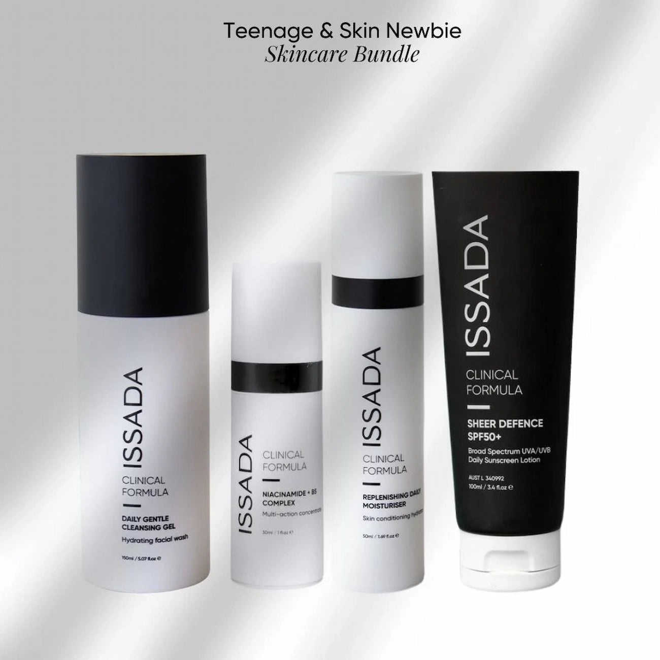 ISSADA skincare bundle for teenagers and skin newbies with a white bag on a light gray background.